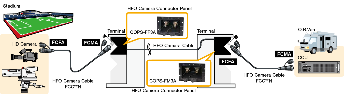Pre-terminated HFO camera connector panel with built-in splice enclosure box provides easy and quick installation between HD camera system and terminal panel or rack. By combining the unit and frame, HFO camera connector panel enables a variety of layouts depending on the system design.