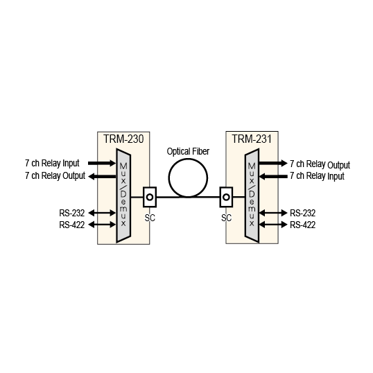Multiplex and optically convert 7 of each input/output relay signal and RS-422/232 signals to transmit long distance over a fiberoptic cable.